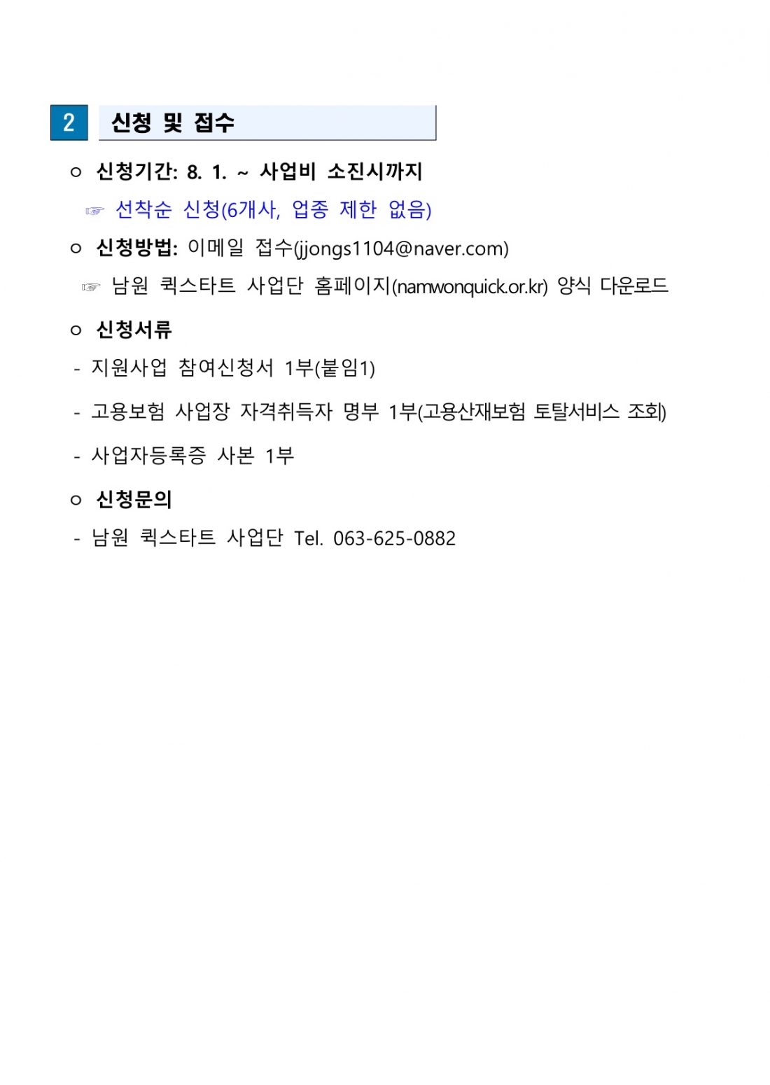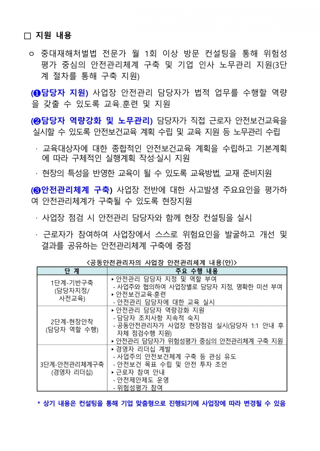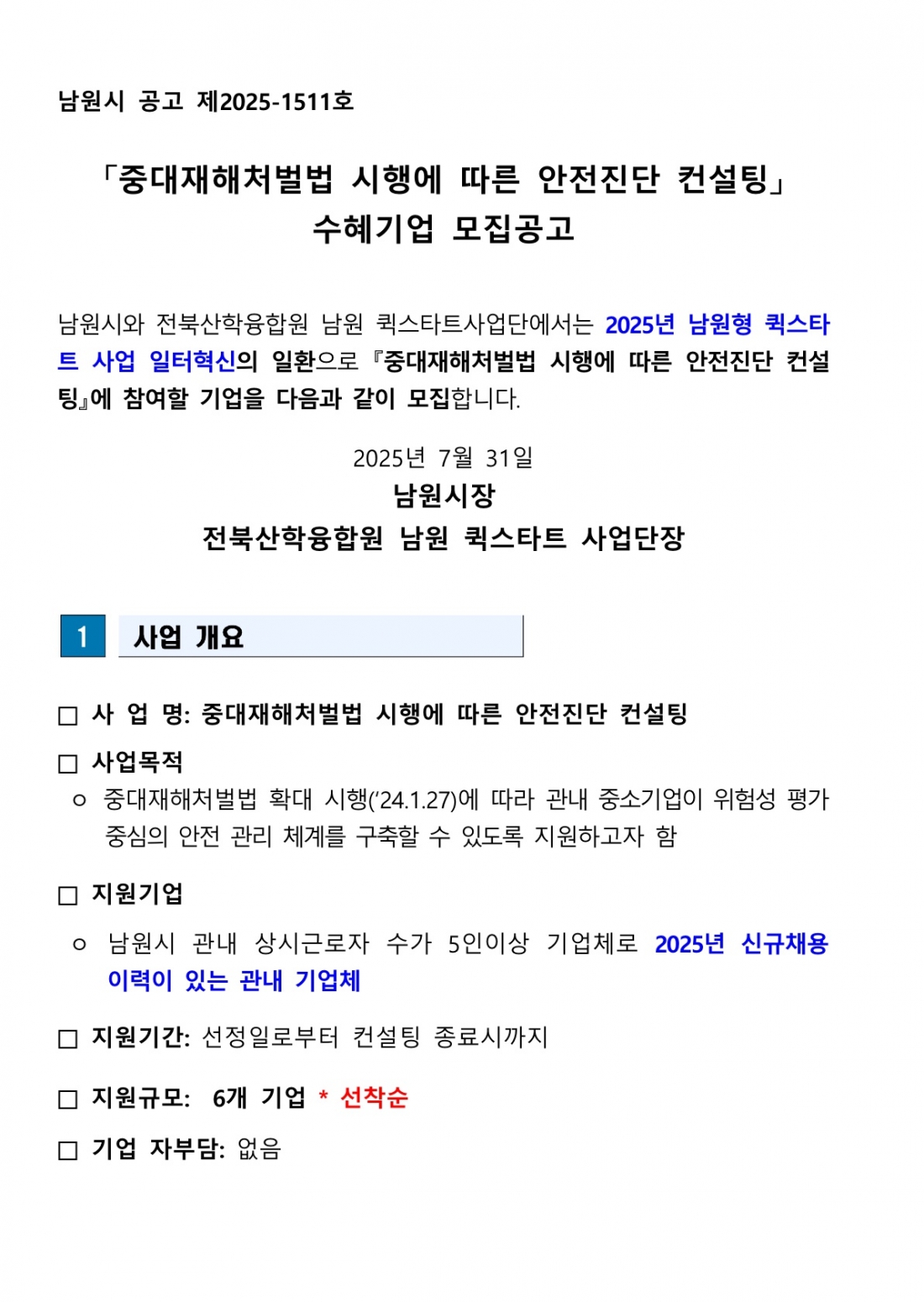 (마감)중대재해처벌법 시행에 따른 안전진단 컨설팅 수혜기업 모집 공고 관리자2025-08-01조회 74 첨부파일 중대재해처벌법 시행에 따른 안전진단 컨설팅 수혜기업 모집공고.hwp (55.5 KB) 중대재해처벌법 안전진단 컨설팅 참가신청서.hwp (55.5 KB) 목록보기 이전글 남원시, 취업 지원을 위해 남원 퀵스타트 사업단-남원시가족센터 협약체결 다음글 남원시,‘중대재해 대응 컨설팅’ 수혜기업 모집...퀵스타트 사업 통해 정부 대응 발맞춰 현장 지원