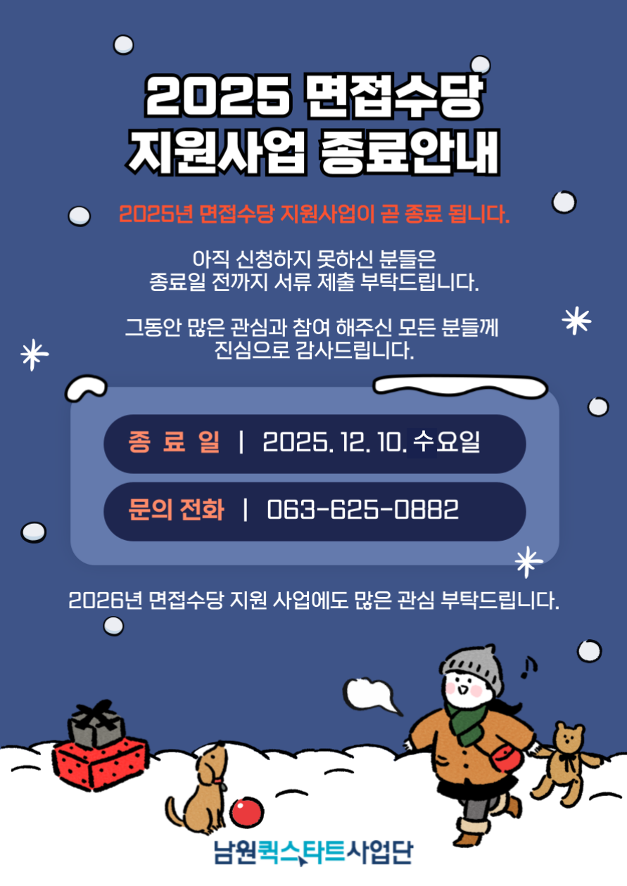 2025년 면접수당 지원사업이2025년 12월 10일(수) 종료됨을 알려드립니다.